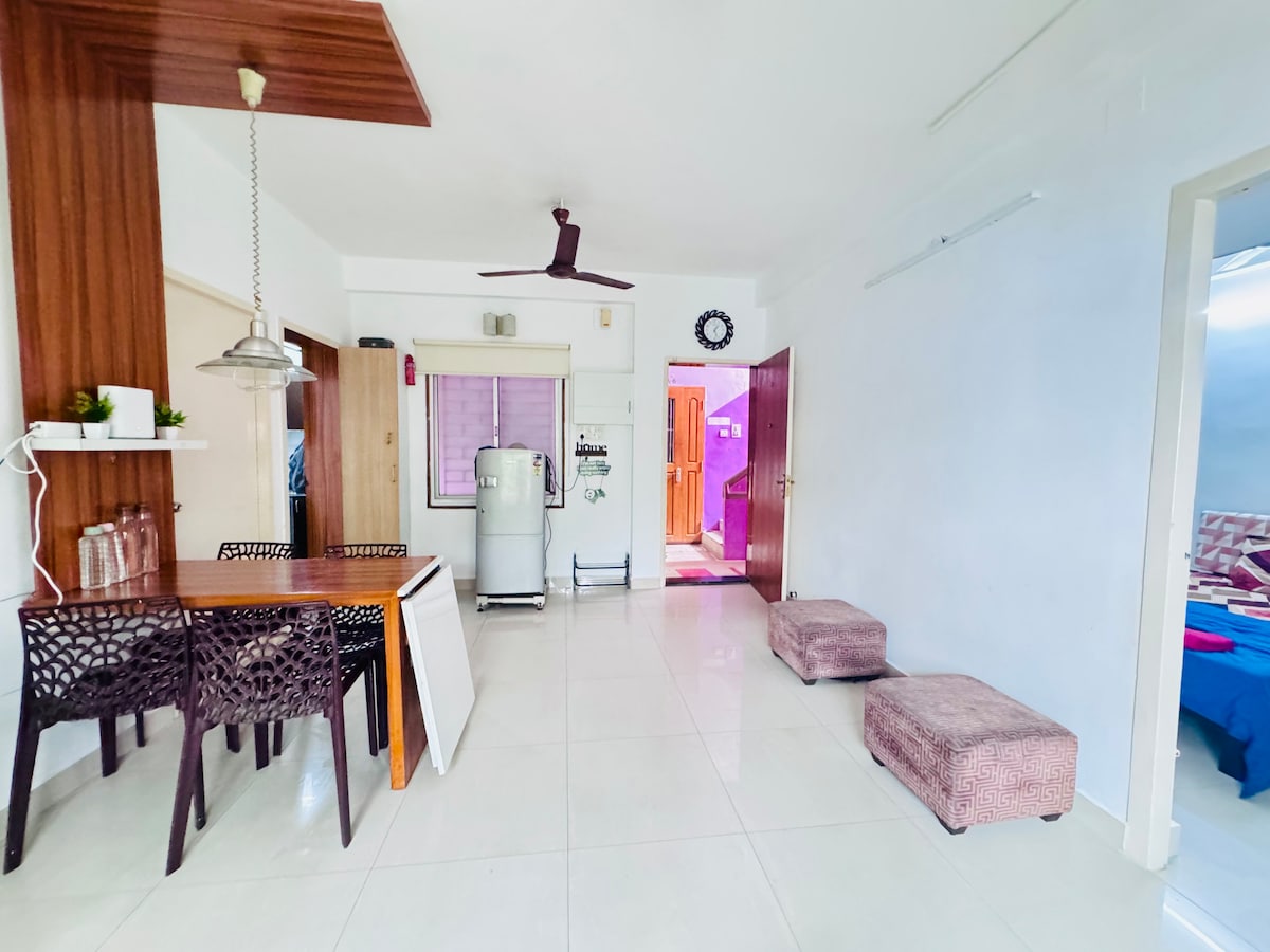 Situated on the third floor of an old residential building, the space features a furnished en-suite bedroom and balcony, and a dining room. No kitchen or cooking appliances, but there is a refrigerator, microwave and kettle. 25-30 minutes to the airport and railway station. 8 minute walk from Nandanam Metro Station. It is ideal for travellers seeking comfort and connectivity. It is accessible via elevator, and it has a shared entrance with a small office (please see the layout photo).