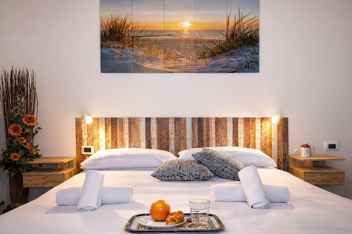 Tramonti Suite is a penthouse with sea view furnished with soft and natural colors. Features a bedroom, living room with fully equipped kitchen, bathroom and two livable terraces, one of which is panoramic, just in front of the bedroom. The apartment is located on the seafront, a few meters from the Ostia pier, from the main square and a 10-minute walk from the train station for the center of Rome and the buses to Fiumicino airport.