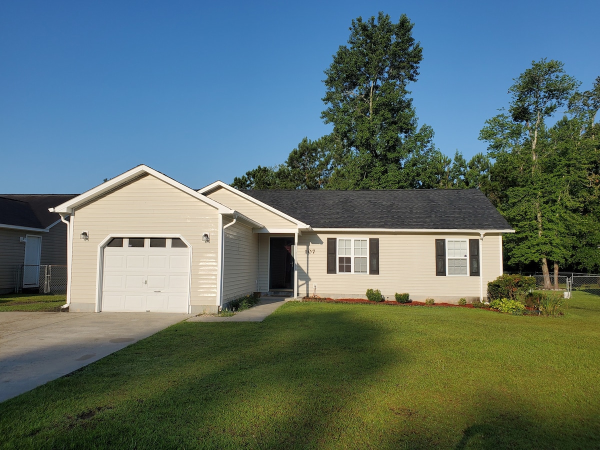 This was my tiny space that I decided to keep adding on to. Started as a tiny house but has grown a little bigger. It is 19 mins from Atlantic Beach and is about 7 mins from Walmart and other shopping centers. Bedroom tv has roku device while living room has Spectrum cable and also Roku on the tv. 2 living room chairs and 1 Twin Xl adjustable bed and 1 Twin bed in bedroom. Guest can use one side of the Driveway. Bedroom also has a small closet. House is beside our main residence.