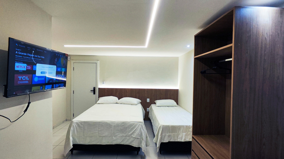 New studio in the historic Palácio do Rádio Building (1949), a landmark of Belém's verticalization. Located on the 9th floor, it offers an incredible view of the river and the sunrise, with no nearby windows—ensuring total privacy. Features a retractable double bed + sofa with 2 single beds, 58” Smart TV, 600 Mb internet, a full kitchen, and a modern bathroom. The location is next to the commercial area with shops and typical food. Cross the street and you are in the historic center. Near COP30