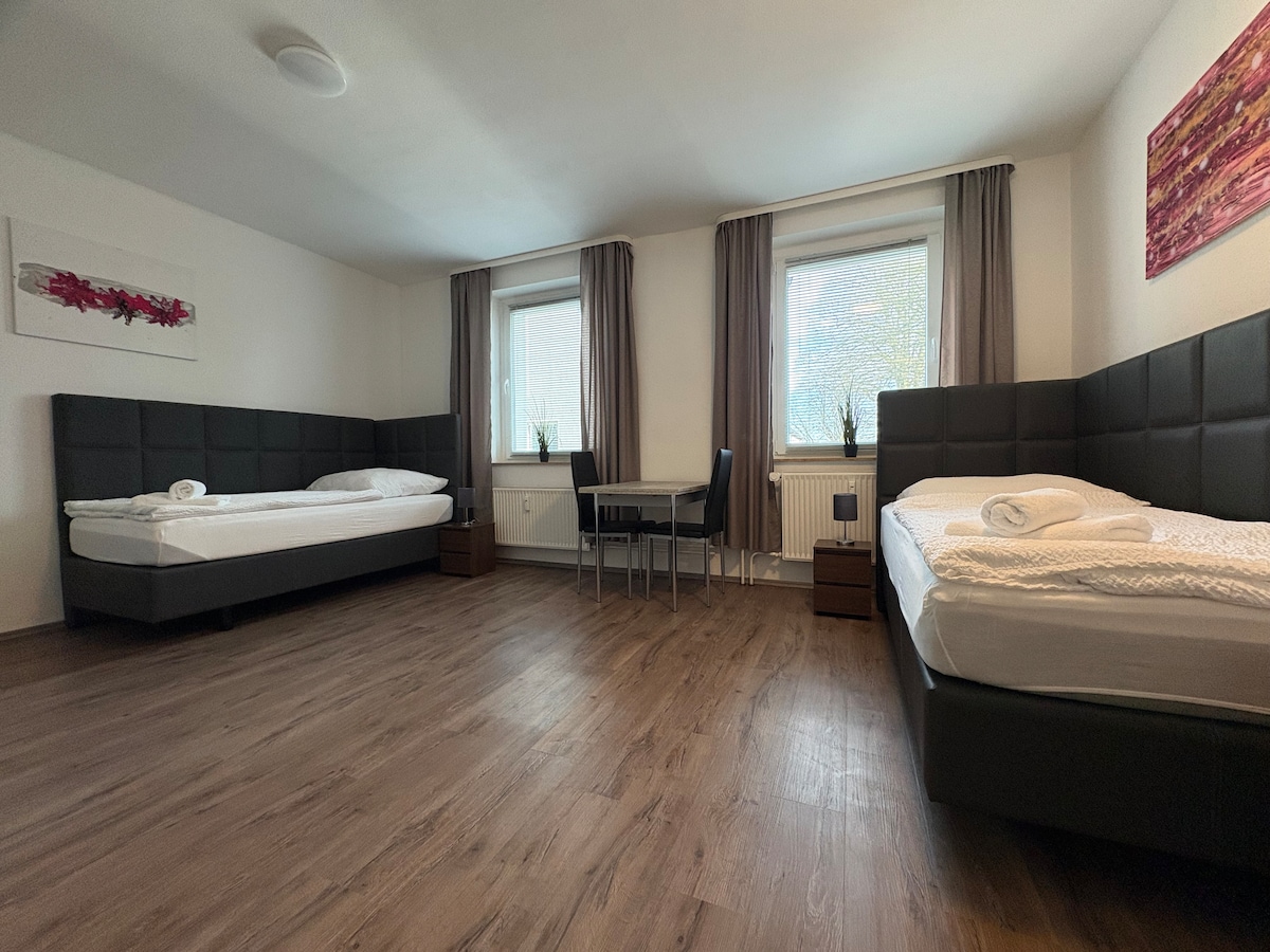 Welcome to CASE Apartments Marl: Stylish studios in industrial chic, centrally located near the pedestrian zone and yet quiet - with their own kitchen, smart TV, fast WiFi and free parking directly at the building. Barrier-free access on the ground floor. A modern laundry room with washing machines, dryers and irons is available to all guests. Supermarkets and restaurants are within walking distance - ideal for business and long stays! The Marl Chemical Park is only a few minutes away by car.