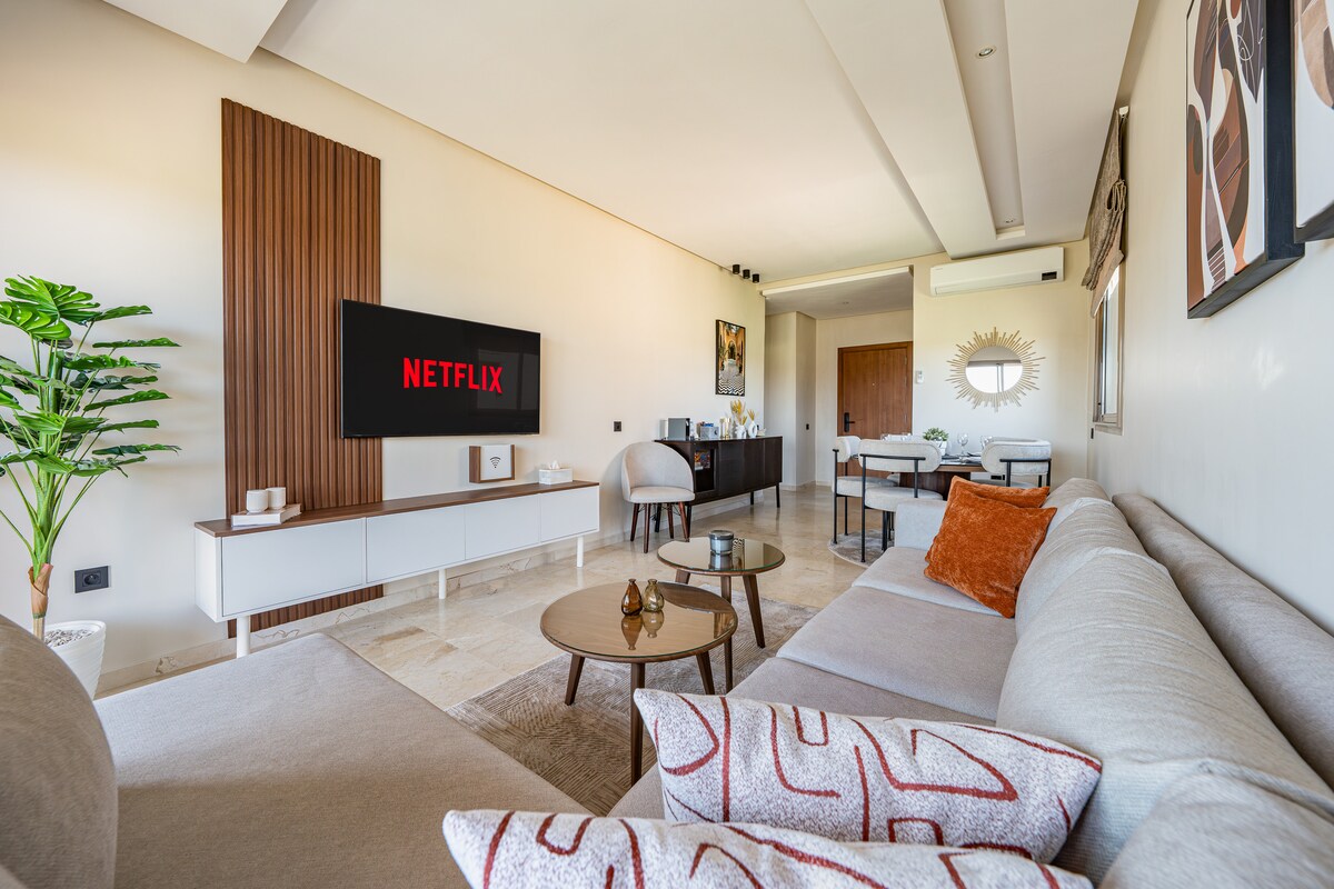 Forget your worries in this spacious and serene accommodation. Enjoy its panoramic views of the Atlas Mountains or hike the 18 holes of the prestigious Golf Montgomerie at your feet and only 10 minutes from the city center! Apartment fully equipped including: - SAMSUNG QLED 65'Q95T TV - Fiber optic 100 mega - Satellite box -Neflix - Air conditioning/area heating - Residential swimming pool for all ages
