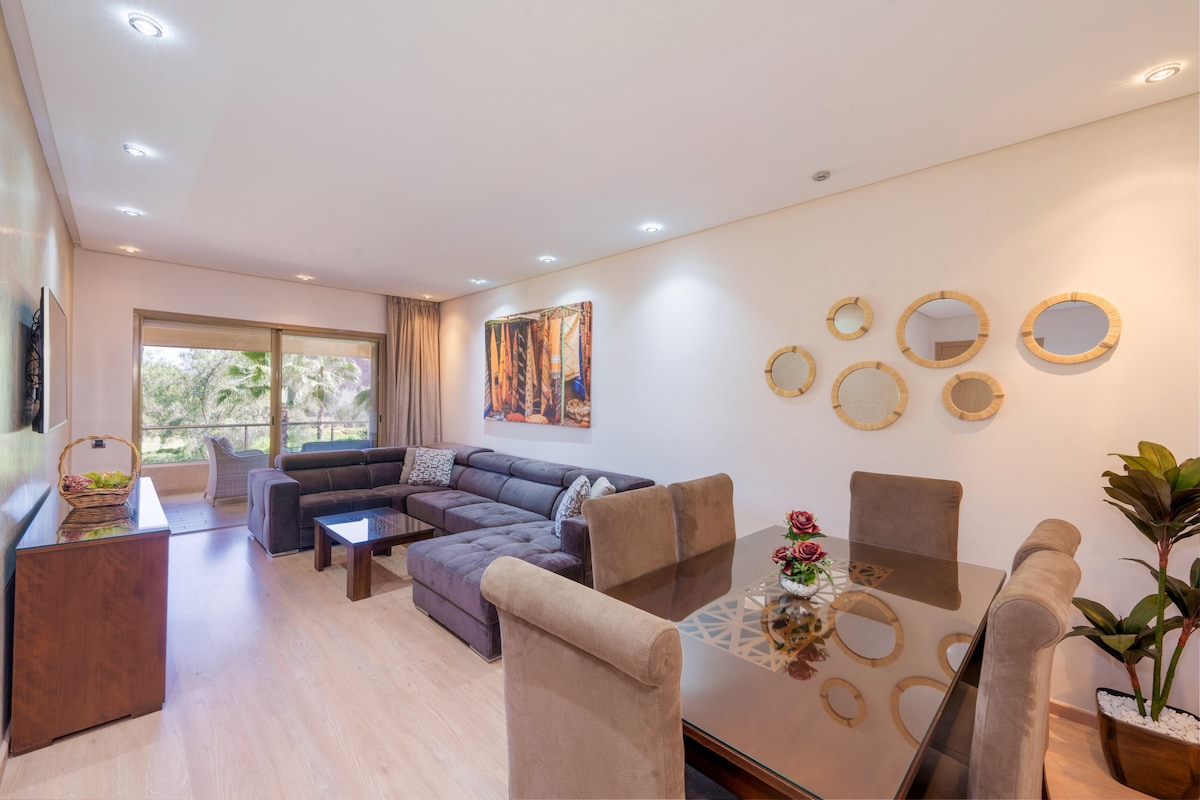 Treat yourself to an exceptional stay in a prestigious golf estate, combining calm and refinement at the foot of the Atlas Mountains. This elegant apartment has a private garden and direct access to the pool, for moments of relaxation in complete privacy. Air-conditioned and fully equipped, it guarantees optimal comfort in a serene and luxurious setting. Perfect for families or friends looking for tranquility and elegance. 3 min away: Airport 5 mins to M Avenue 2mn: Carrefour