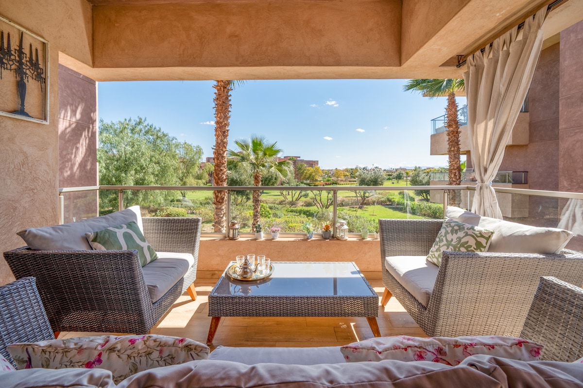 Welcome to the cozy & modern apartment in the Prestigia Jade Residence. Designed to meet the needs of those traveling for business, with family or friends - 2 bedrooms, 2 bathrooms - Living & dining room - TV, WIFI: Netflix, Amazon Prime & Disney + - Equipped kitchen - Terrace with golf course view 1 min walk to the golf restaurant 10 min by car: - Airport, Menara Mall and Mazar Mall and Hivernage district 15 min drive to Jemaa elFna Square and Guéliz district