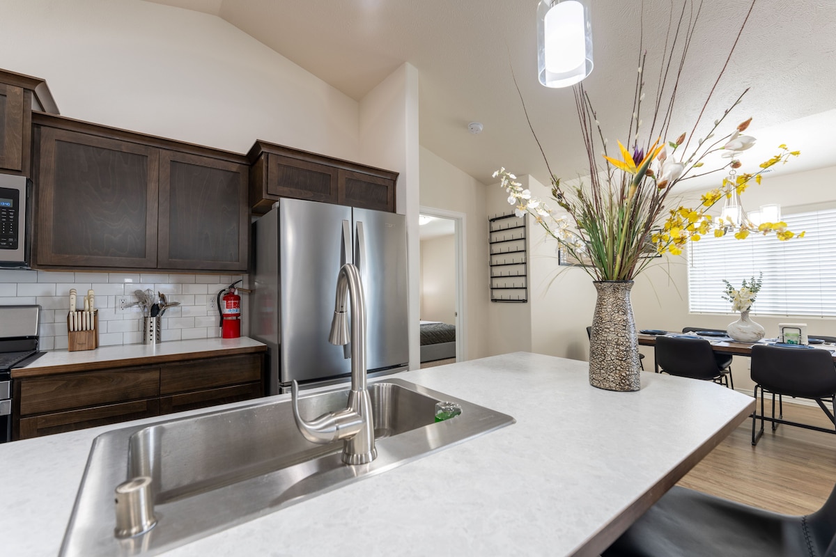 This brand new space will accommodate your group of 2 with every creature comfort. We are pet friendly with pre approval and a fee. The full kitchen is well stocked with everything to make a great meal. Enjoy your meal on the shaded patio. The beds are high quality and comfy. The internet will support video conferencing. We monitor the outside of premises with Ring security cameras. Please read our house rules for all details prior to booking