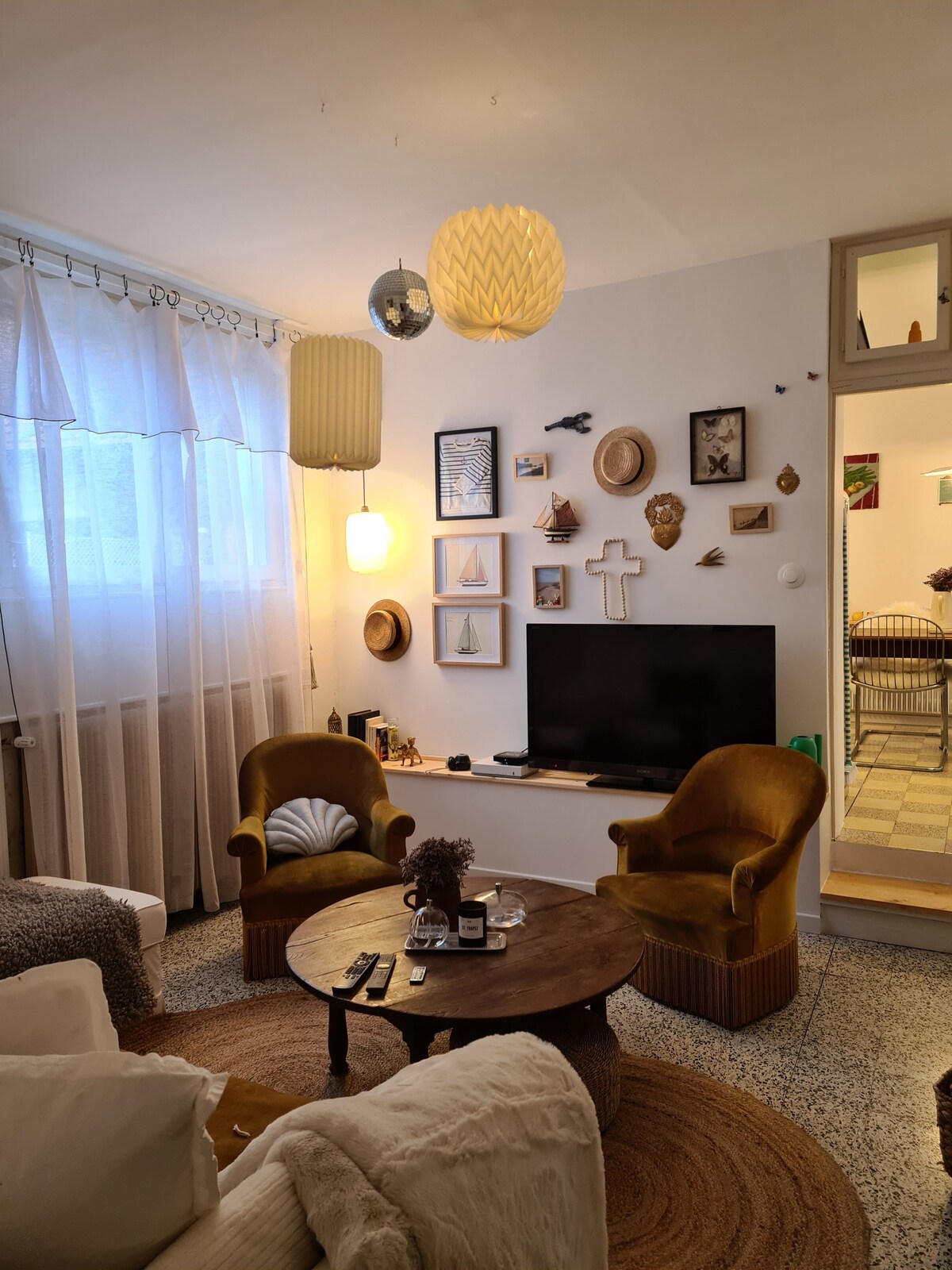 Unusual accommodation The trailer is fully equipped, small kitchen area that opens on one side to the bed and on the other to the dining table as well as the TV, and finally to the bathroom. The kitchen is equipped with a fridge, electric stove, microwave and coffee maker. In the garden you will find two deckchairs with table and chairs to fully enjoy the sun. A charcoal barbecue will also be available. Unfortunately, no pets are allowed