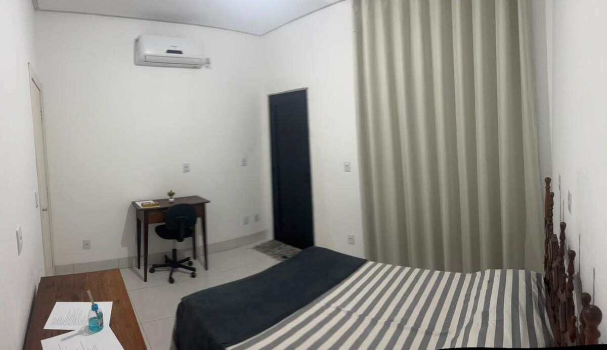 Espaço totalmente privativo, contém quarto, copa/cozinha e banheiro. Entrada individual. Comodidades: cama casal, ar condicionado, cômoda, mesa, cadeira, frigobar, tanque, lava e seca, utensílios básicos de cozinha, espelho, cortina, fogão, botijão, chuveiro, filtro de água, microondas e outros. Com excelente localização e fácil acesso a tudo o que precisar, próximo ao banco Sicoob, hospital, pronto atendimento, supermercado, posto de combustível e lanchonete.