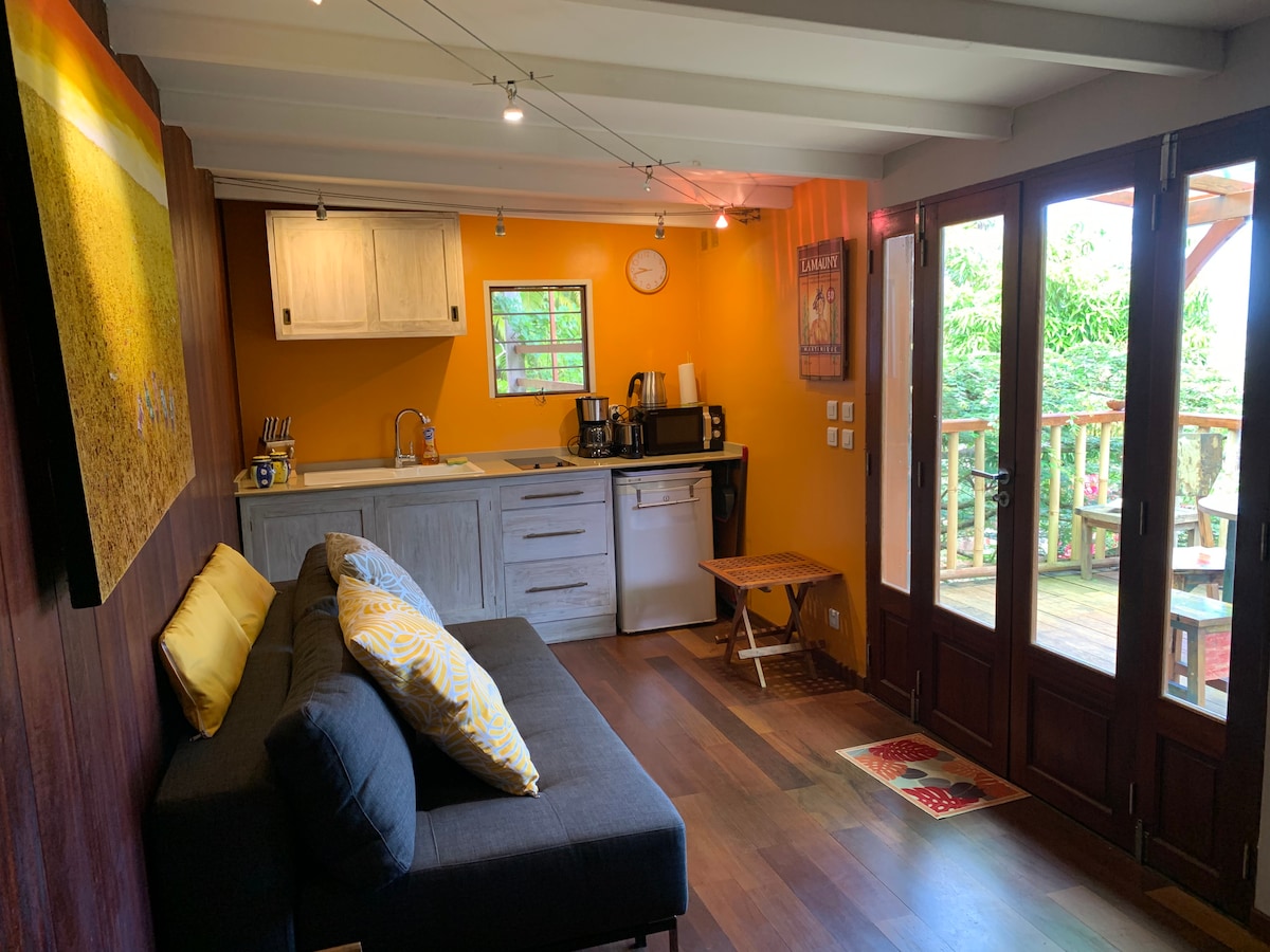 Nous vous proposons un studio indépendant et entièrement équipé, de 25m² avec sa terrasse devant un jardin tropical. Il est situé à 5 min à pieds d'une des plus belles plages de la Martinique, la pointe Marin. située sur la jolie commune de Ste Anne, où le tourisme est présent, sans être envahissant. Dans le cas où vous viendriez à 2 couples en Martinique, sachez que nous louons, dans la même maison, un deuxième studio, identique au premier.
