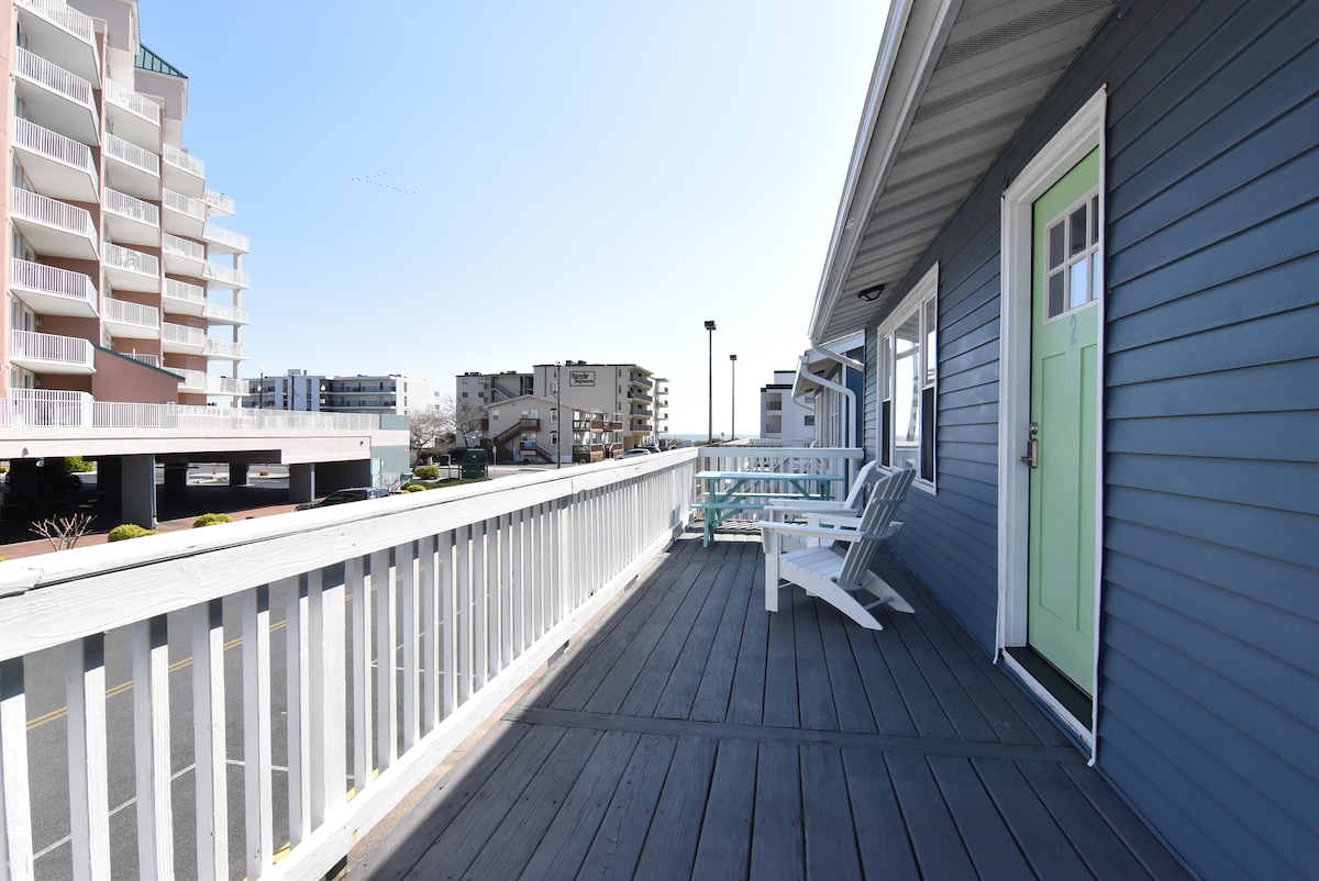 Take it easy at this peaceful place while you enjoy the sound of the waves and ocean views. This one bedroom one bath walk up is ocean front. Take in the salt breeze with a good book and a rest in the hammock on the spacious covered deck . Fully stocked kitchen with all the comforts of a beach getaway. Close to all that Ocean City has to offer, with safe areas to walk in the evening, and close to restaurants and mini golf.
