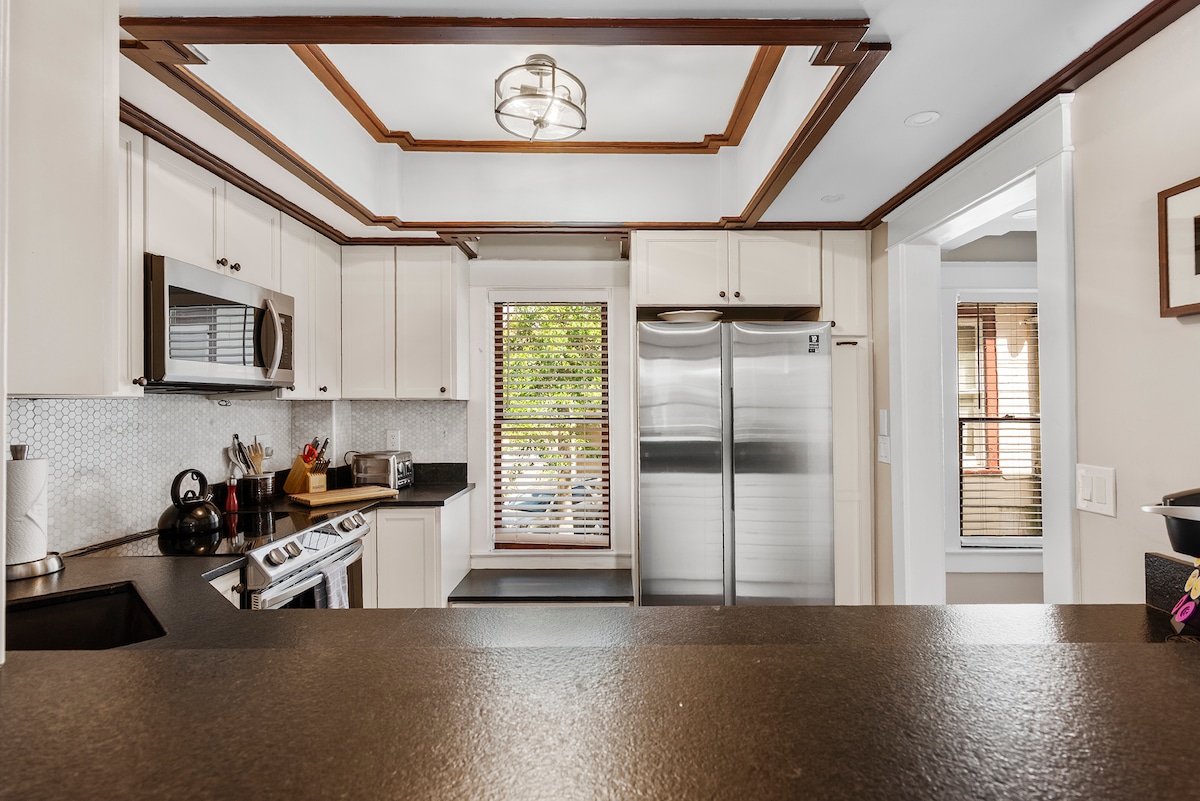 This corner apartment features high ceilings, exposed brick, 9 windows with riverfront views, 2 cozy bedrooms and a grand open kitchen complete with a large island and dining area that flows into an open living room filled with natural light. With classic design touches as well as modern features you’ll be sure to appreciate the beauty as well as the views and convenience. It features a full kitchen with an island, tile and hardwood floaring, 2 comfortable bedrooms and an updated bathroom.