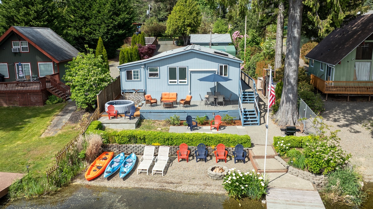 Lakeside hot tub, BBQ, dock & more!