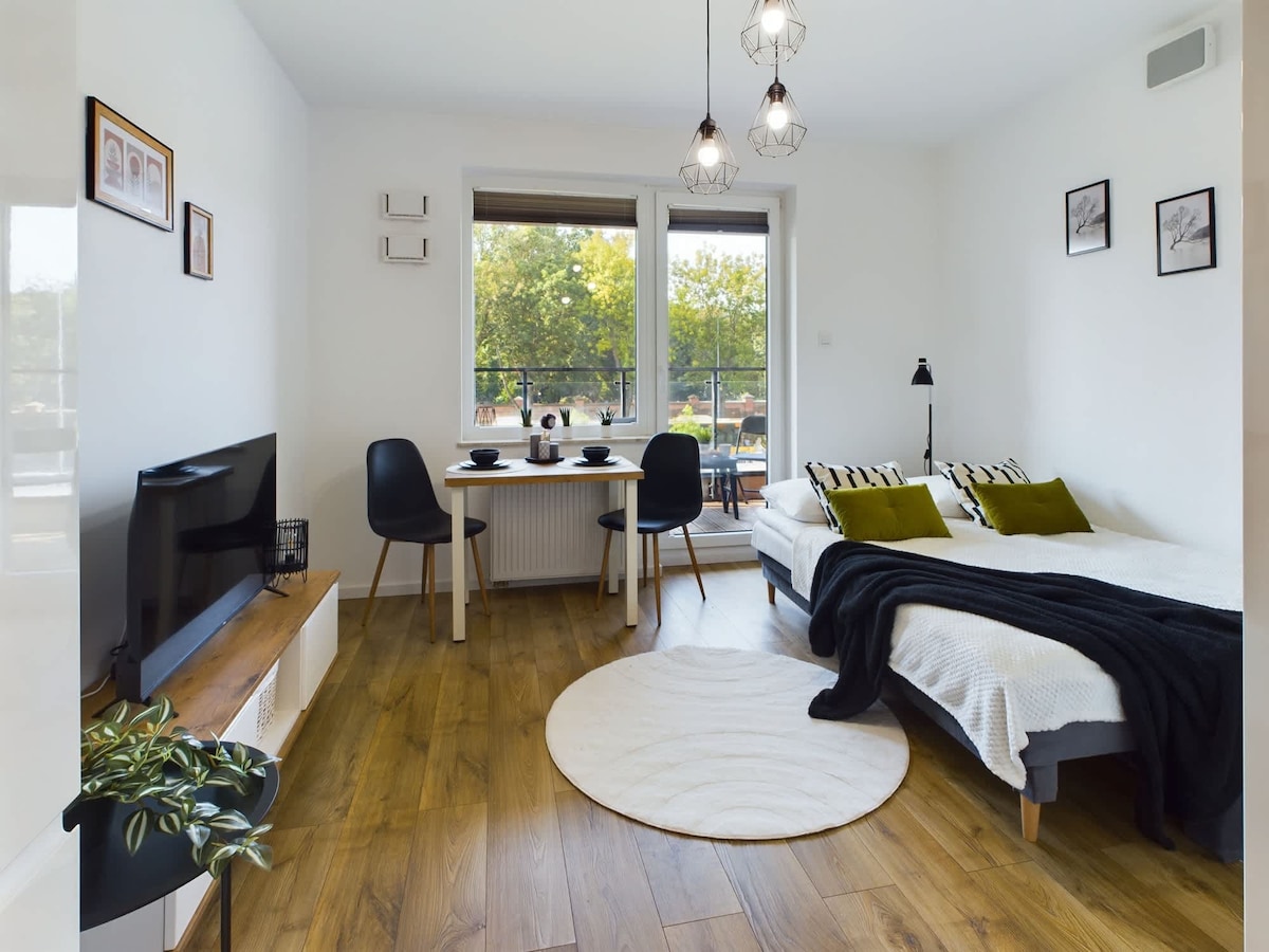 Spacious, modern apartment with a huge living room, a big balcony and a view over the city, in the heart of Lodz, but in a calm and quiet neighbourhood, located in luxurious estate. Close to the vibrant main street of the city - Piotrkowska with many restaurants and clubs. Beautiful park, tennis courts, concert and event halls, Expo Lodz, a cinema and a shopping mall in the neighbourhood, walking distance from the apartment. Have a great time in Lodz!