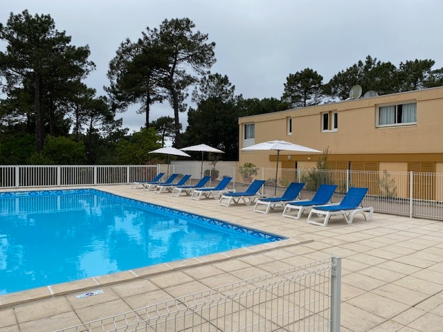 26 m2 studio on the 1st floor with a small balcony overlooking the pine trees. Ideal for relaxing alone or as a couple, walking, cycling (bike paths and a bike rental at the foot of the residence) near the lake and the ocean. No wifi. The city center with restaurants, shops, water activities are 400 m away on foot, the ocean Carcans beach is 4 km away, Lacanau-Ocean 14 km away. Bombannes with its state forest and its diversity of activities near the lake are 3 km away.