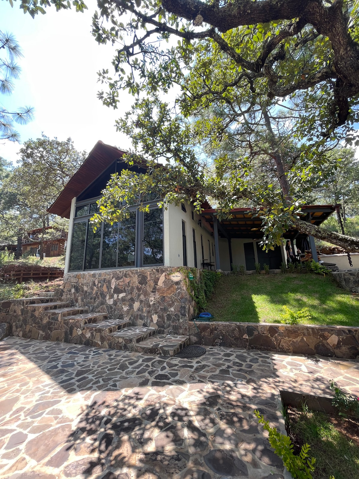 Disfruta de una cabaña en el bosque totalmente equipada para que tu experiencia sea inolvidable. Consigue un descanso de lujo en sus colchones de calidad, diviértete en su terraza con asador y estufa, ten una noche romántica en su terraza con chimenea. Deja que tus hijos corran y rían en la explanada jugando en la casita infantil y quemen bombones en su fogata. Ubicada dentro de la seguridad del fraccionamiento Los Cazos con acceso a La Cascada El Salto.