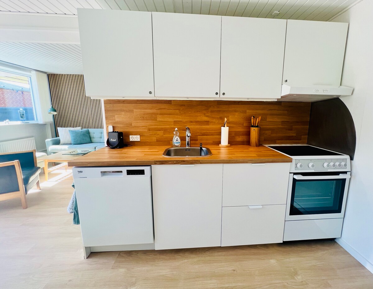 70 m2 true summerhouse vibe, 50 m2 wooden terrace with afternoon and evening sun. Sleeps 4-6 in 3 bedrooms: 1 double bed and 2 3/4 beds. Fits really well for 4 people, but 6 can be squeezed in if you are a little close. There are bed linens and towels. Full kitchen, dishwasher, Wifi, Smart TV, wood burning stove. Washer/dryer. Quiet quarter. Access to boat bridge at Sunds lake just opposite by the turning area. 5 min to supermarket. 15 min to Herning.
