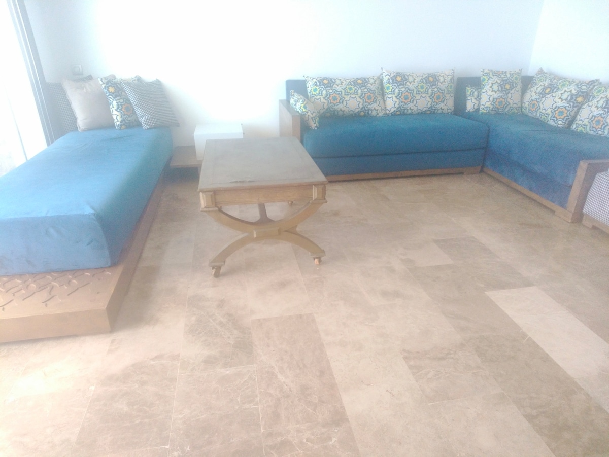 Welcome to Mehdia Enjoy this beautiful luxurious apartment, conveniently located a 1-minute walk from the beach, perfect for holidays with family or friends. The accommodation is equipped with everything you need in a quiet and safe area and close to shops and restaurants for a comfortable stay: modern kitchen, spacious living room, TV, Wi-Fi, utensils, etc. It can accommodate up to 6 people, with extra mattresses available (not visible in the photos)