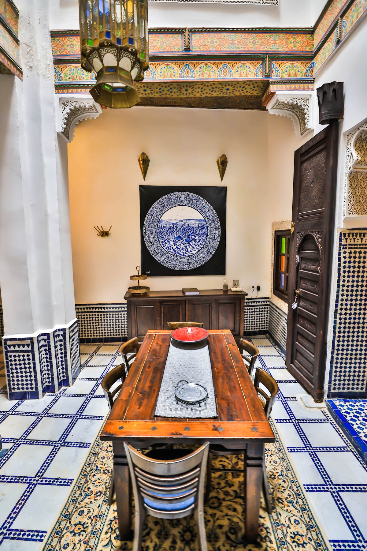 Masterfully blends timeless Moroccan style with modern design Located in the heart of the old Fez Medina. Offers an unparalleled experience. The expansive suite features a large bedroom, living room adorned with Moroccan mosaic private bathroom and air conditioning. Hand-picked furniture and exquisite fabrics create an atmosphere of elegance. Start your day with a delightful breakfast on your private terrace and enjoy ultimate peace and privacy. Experience the magic of Morocco like never before!
