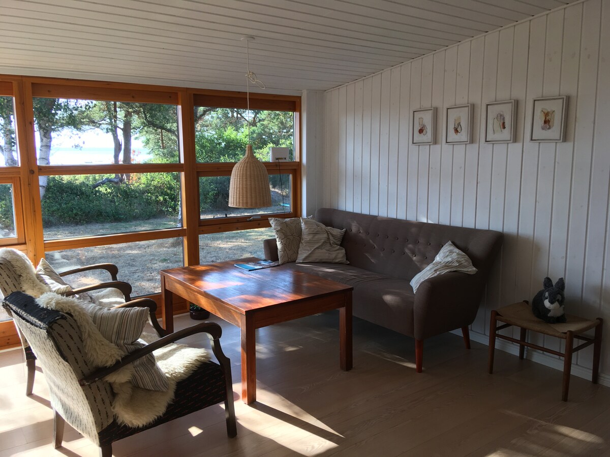 Viken with fantastic sea views! Welcome to a fresh cottage with made beds. Cleaning, sheets and towels are included in the price. The cottage is about 20 sqm with a small kitchenette (stove 2 burners and refrigerator with small freezer compartment) bathroom with shower, sink and toilet, dining table, sofa and bunk bed with 120 cm down and an 80 cm bed up. The cottage is newly built and is located next to a private residence, has its own patio, with chairs and tables, parasol, drying rack and its own parking.