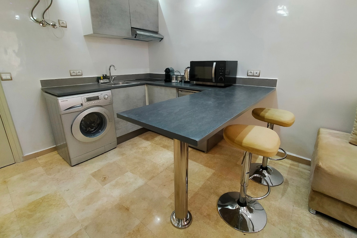 🌿 Kick back and relax in this calm, stylish space. 🌿 Enjoy a stylish experience at this centrally-located place. Pleasant 🌿 apartment, fully equipped - Secure residence - Swimming pool - Double bed - Netflix - Youtube - AC. 🌿 In the heart of L'Hivernage. 👣 800 m from M Avenue 👣 600 m from Menara Mall 👣 600 m from Paul Menara Cafe 👣 600 m from the Les Maîtres du pain café/bakeries