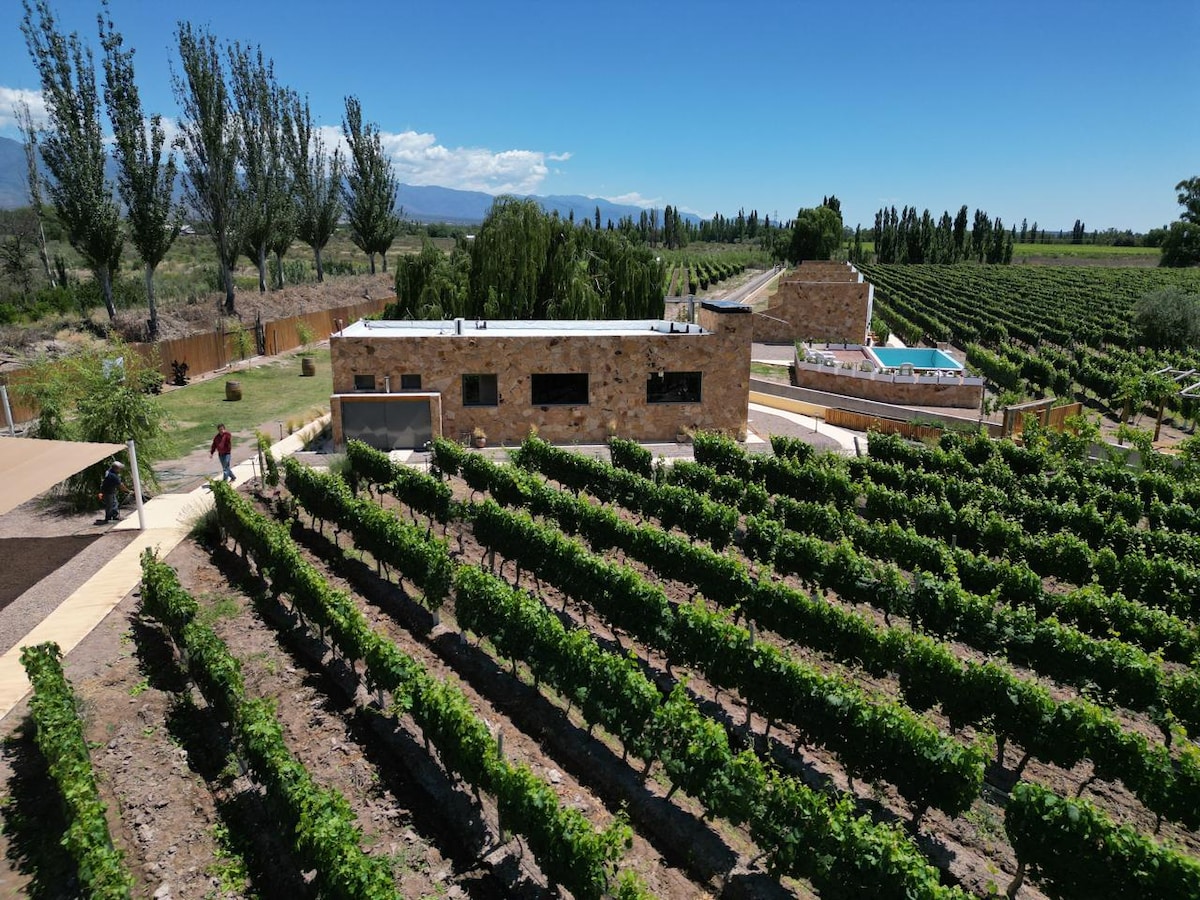Country house with modern architecture. Three bedrooms. Two full bathrooms. Living room, dining room, and kitchen. Second living room on the mezzanine. Indoor fireplace. Electric and kerosene heating. Gallery and garden. Upstairs deck with views of the Andes Mountain Range. A fire pit and mud oven in the garden. WiFi. Totally immersed in the tranquility of the valley (no neighbors nearby). 10 minutes from Downtown. 1.5 hours from Mendoza city and international airport.