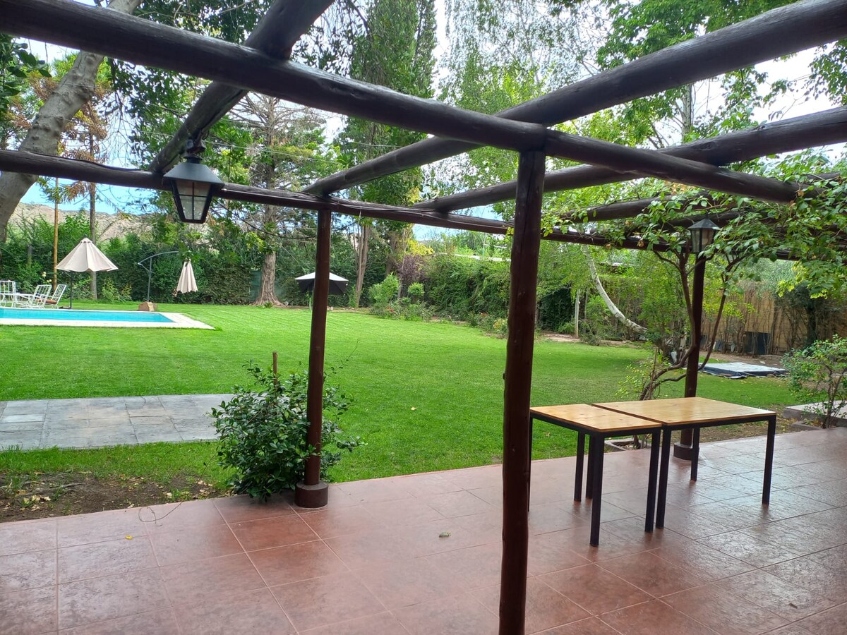 Country house, bright, spacious areas overlooking the garden, large park ideal for relaxing and enjoying the tranquility and magic of Poder Perdriel, with family or friends. Located on the wine route circuit, numerous wineries in the area to visit. Guests will have access to a two-car garage, barbecue, and swimming pool.