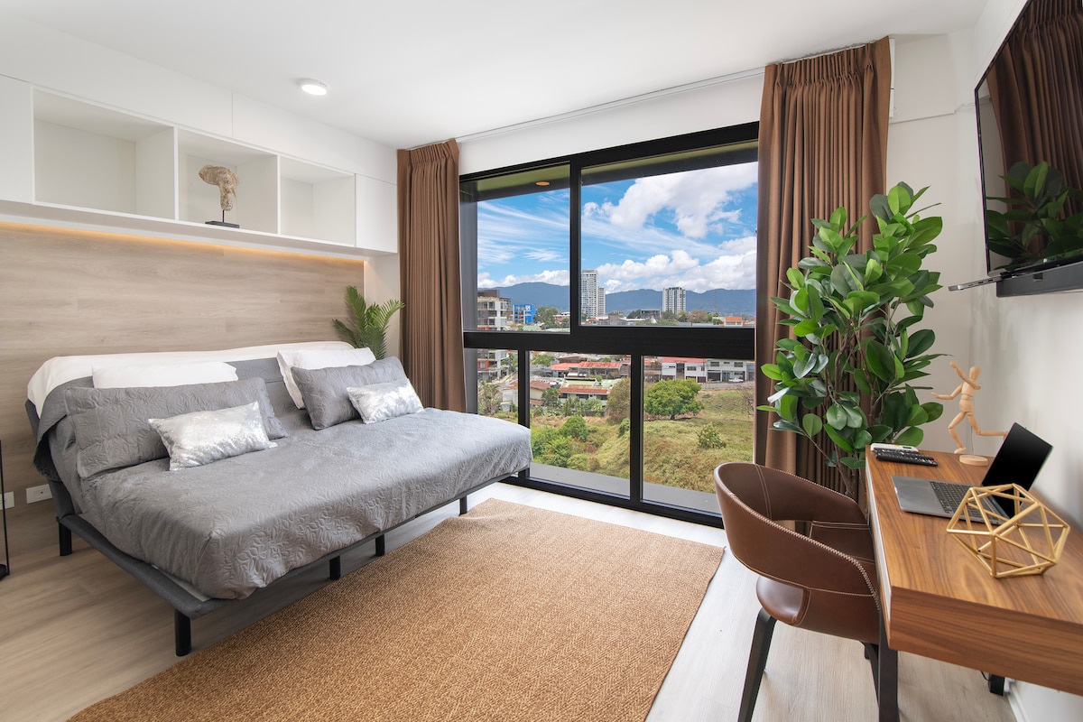 Keep it simple at this peaceful and centrally-located place. Experience the exclusivity of this modern studio in Barrio Escalante, with an unbeatable location just minutes from downtown San Jose, 30 minutes from Tobias Bolaños airport. Enjoy your stay surrounded by smart amenities and beautiful views of the city, complete with Wi-Fi connection, a full-size bed, private bathroom, kitchen and access to superior conveniences, such as a rooftop with jacuzzi and deck, lounge room, gym and BBQ area.