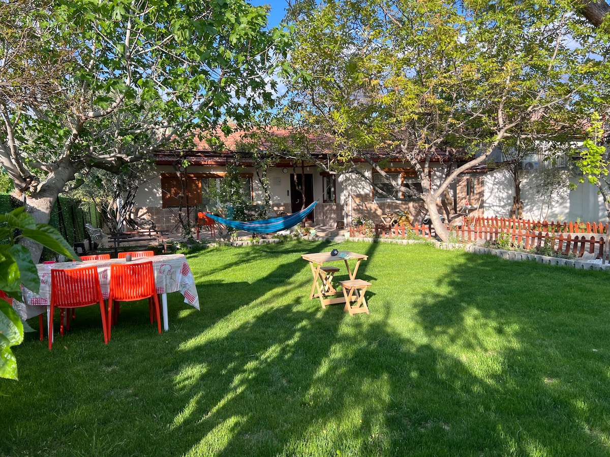 Have unforgettable experiences in this unique and family-friendly place. A villa that appeals to fully detached large families in the area very close to Travertines in Pamukkale, a huge lawn garden and seating area where your children will love, you can barbecue in the lush green garden, and there is a fully equipped kitchen and air conditioning in all rooms.
