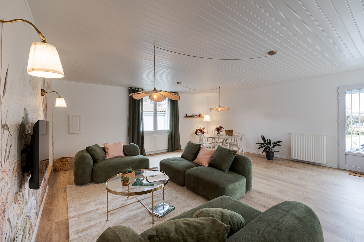 12 minutes from Puy du Fou, house renovated in 2018 at the bottom of a small cul-de-sac ending on a large green space. Ideal for 6 people (4* rating by the offices of tourism of France) it nevertheless has 8 beds. 3 bedrooms, 2 bathrooms with toilet upstairs, living room with open kitchen, toilet on the ground floor, enclosed garden, terrace and BBQ. Private parking. Wifi Common outbuilding with another cottage offering fun activities (table tennis, foosball, outdoor games)