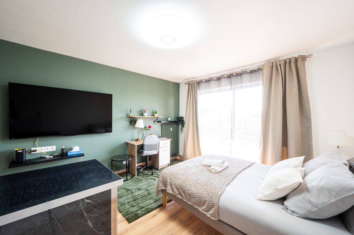 STUDIO WITH BALCONY PRIVATE PARKING, BAKERY TRAIN STATION and BUS in front, Luxury RESIDENCE. BALCONY overlooking the park, BAKERY at the foot of the building, Recent DECORATION (2025) Perfectly suited for your tourist or business stays.
