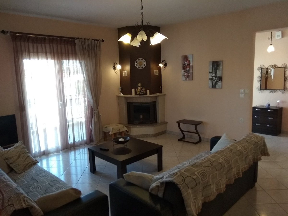 The apartment is part of a residence complex of 6 apartments and is located in the settlement of Agios Nikolaos. It’s the middle right apartment. There is a cozy living room equipped with a smart TV and an air conditioner. There is also a fully equipped kitchen. There are 2 bedrooms and 2 bathrooms. The visitors can enjoy the view from the balcony. You can access the central square of the village by foot in three minutes,where you can find all kinds of shops.
