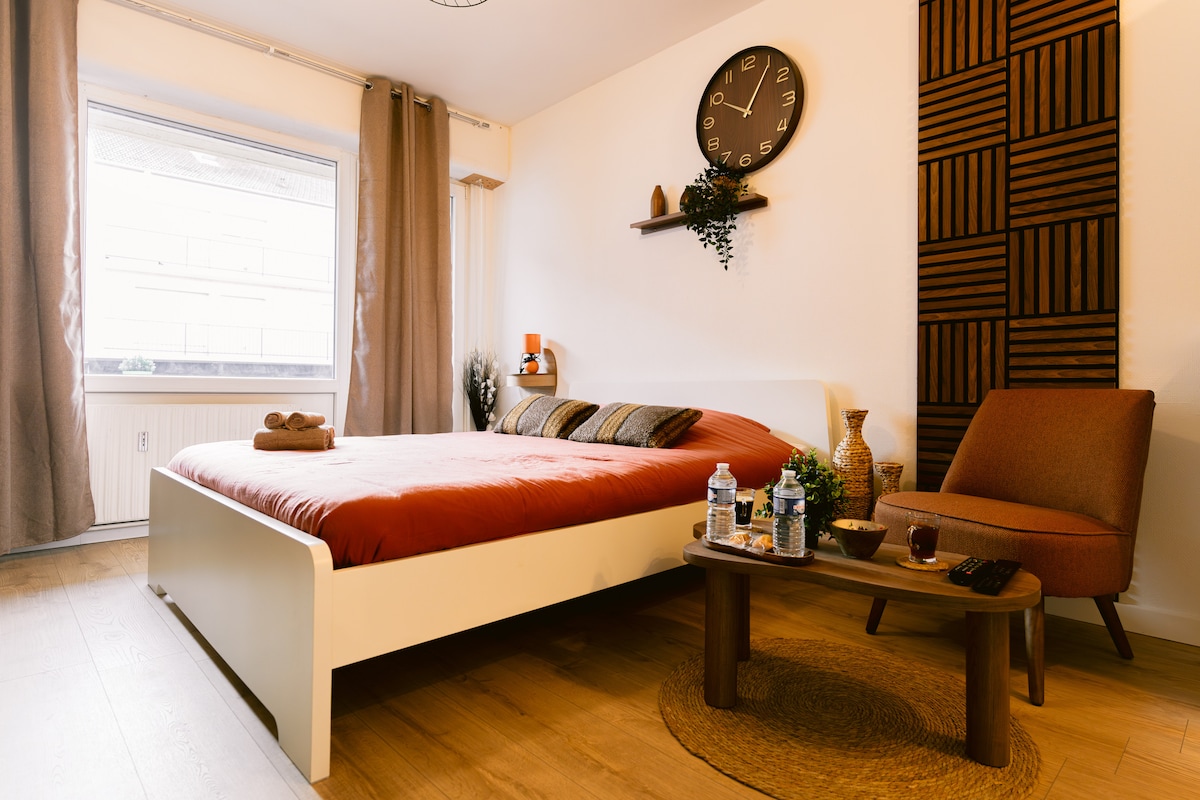 Charming studio located opposite Snowworld (indoor skiing) 🎿⛷️and 400 m from the galaxy concert hall accessible by a staircase or road located below the accommodation. Tourist center (🐼🦍luminescence zoo,💆♀️Villa Pompeii Thermapolis,🍿cinema and restaurants 🍔) in 👣 All these activities accessible within 5 minutes on foot or 1 minute by car. Free parking in front of the accommodation Reversible hot and cold air conditioning. Warm atmosphere with parquet flooring.