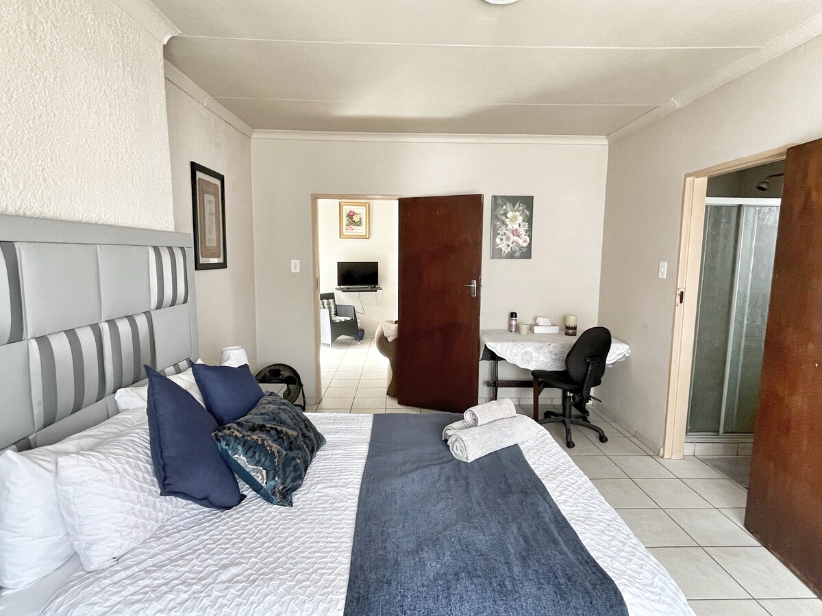 A very comfortable guest suite located in Brackendowns Alberton, ideal for a couple or single person. With its own private entrance and secure under cover parking. We have solar installed, so we are not affected by load shedding. A tea, coffee station and mini fridge is provided in the guest suite. TV with Netflix. Plenty of cupboard space. The en suite bathroom has a shower, basin and toilet. Please note that this is not a self catering establishment, there is no cooking facilities.