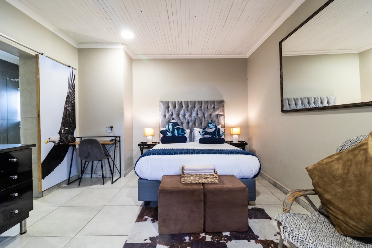 Charming self-catering cottage in Henley on Klip – a tranquil retreat for couples or business travellers. Spacious bedroom with queen bed, private shower, cozy lounge/kitchenette with sleeper couch (child 12+), TV, Wi-Fi, and essentials. Private patio with pool and garden access. Free parking, fan, and warm hospitality. Close to wedding venues, Bass Lake (3.5 km), Suikerbosrand Reserve (17 km), shops, and restaurants (1.5 km). No kids under 12. No Pets allowed.