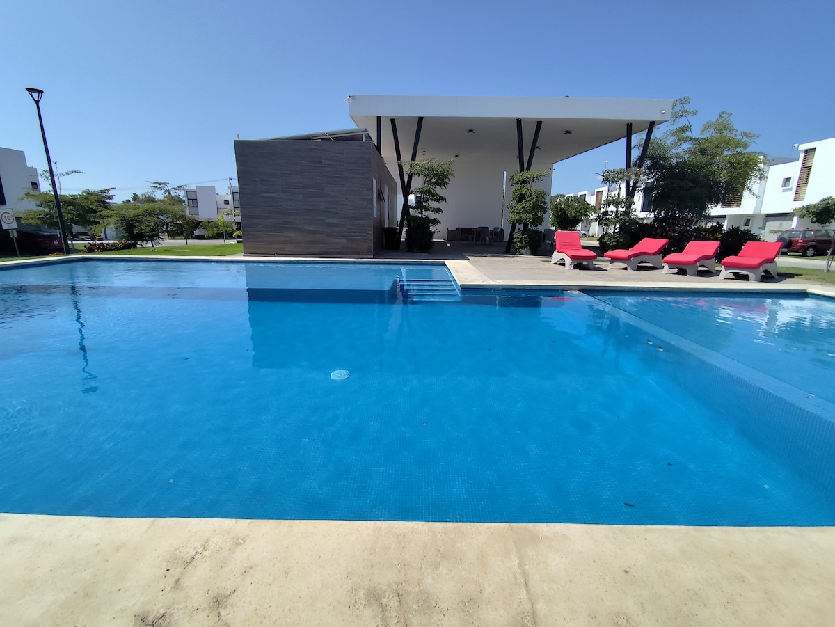 Una Casa muy Linda y Comfortable y sobre Todo mucha tranquilidad, con playas a solo 10 minutos de distancia, con centro comerciales, como la Gorrial, Sam's Club, Walmart, y muy cerca de transporte publico, y tambien una zona muy tranquila para sus ninos, con parque muy cercano y asadores para poder disfrutar de una linda tarde en familia. Y contamos con aire acondicionado en toda la casa