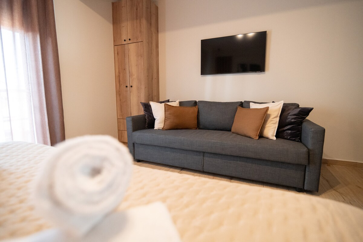 A studio apartment with a view of the Ionian Sea, just 2 km from the historic centre of Preveza. The apartment features a large double bed, a sofa bed (sleeping area 130*190 cm), and a fully equipped kitchen. The seaside area of Pantokratoras is one of the most beautiful neighborhoods in Preveza, with a lovely beach right below the apartment, as well as several others within less than 1 km. It can also be combined with the Ionian Blue Apartment.