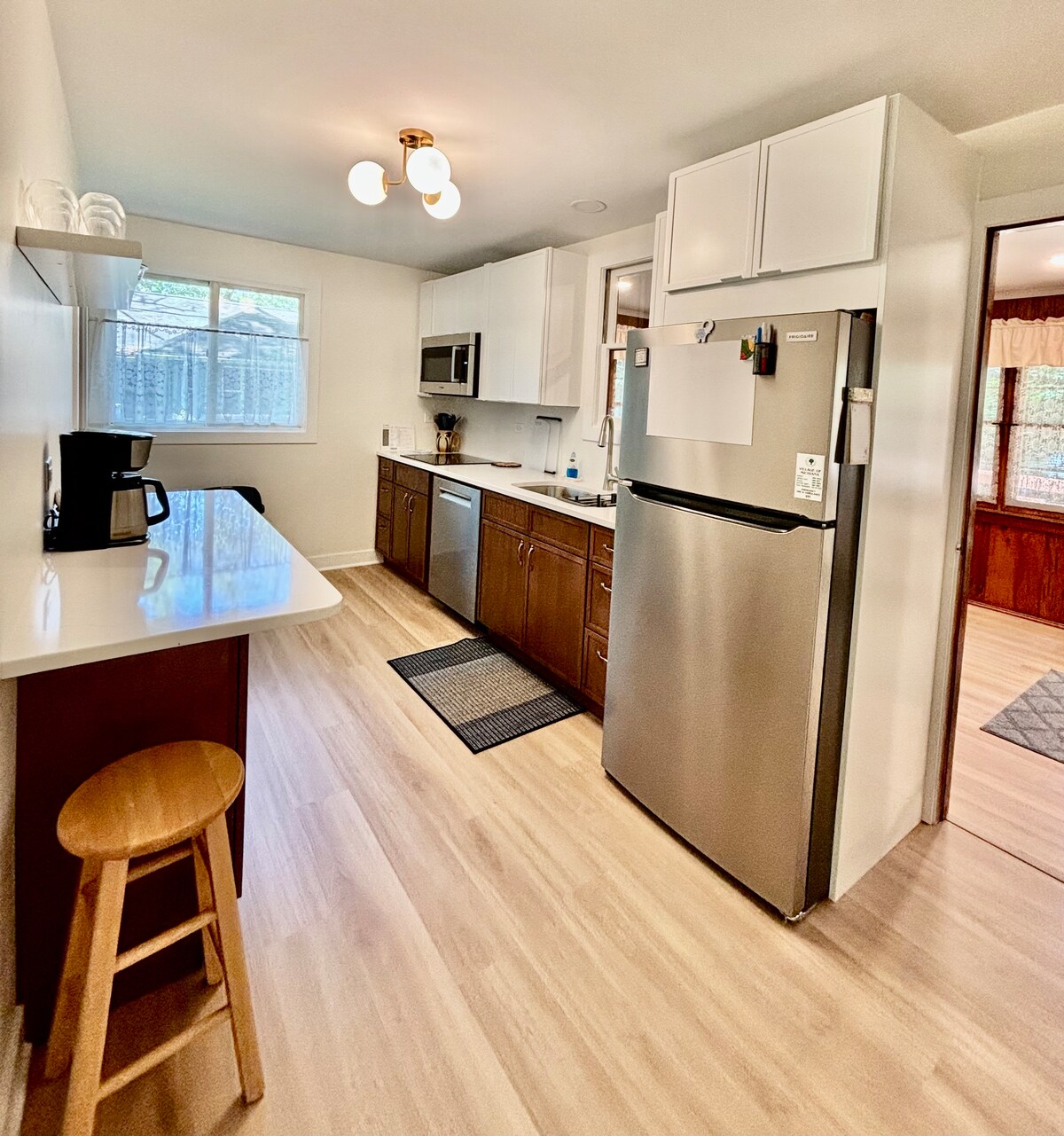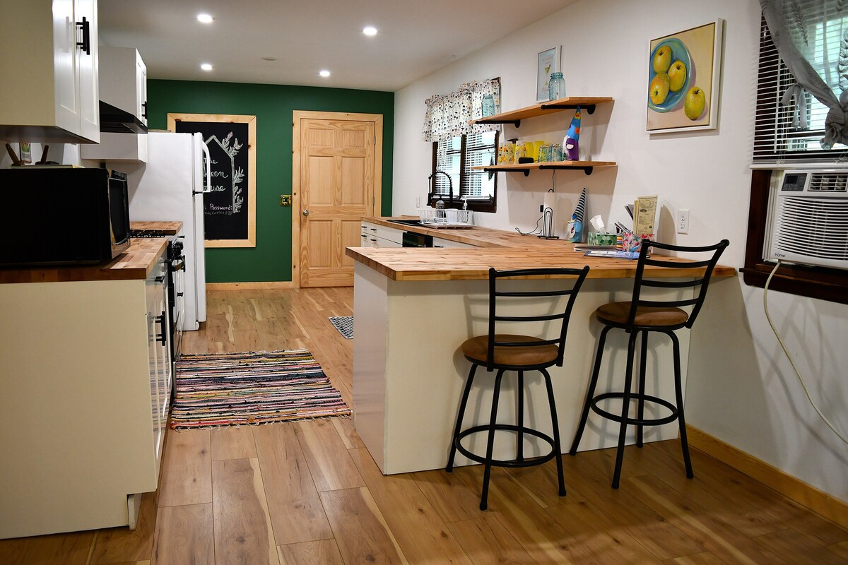 Cozy, charming, romantic and modern. Huusli is the perfect place for a couple to getaway, not too big, not too small. Soaring ceiling with wood burning fireplace greets you in the main living area with an updated kitchen, remodeled bathroom and two adorable bedrooms. Bonus is the four-season room where you can have all your meals or enjoy your morning coffee surrounded by nature, but without the fear of bugs. Make new memories, celebrate an anniversary or just relax in this magical place.