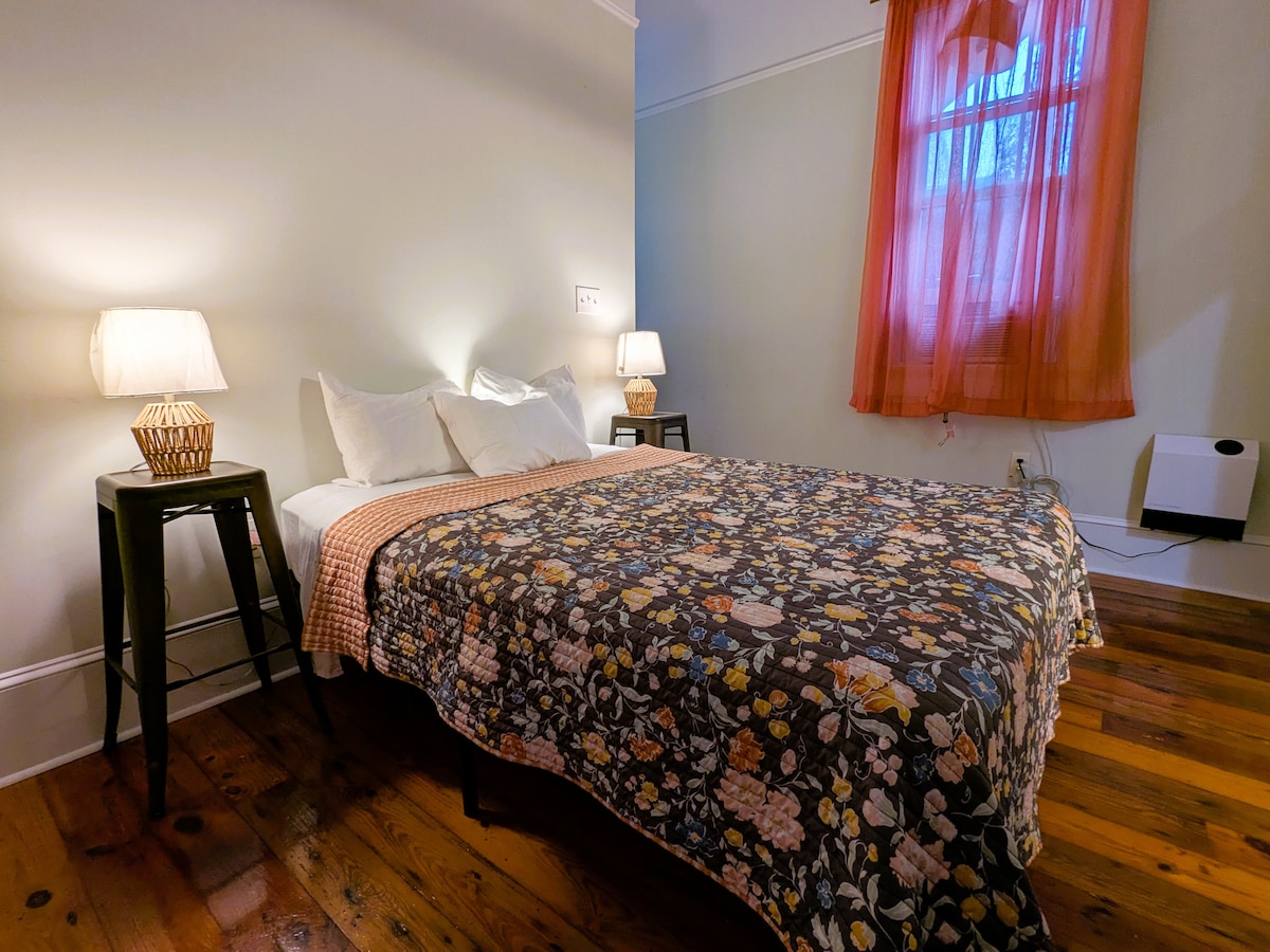 Clementine's Room is a lovely hideaway in Mid City on Bayou St. John. It is simply a bedroom/bath with tile shower, washer/dryer, and king bed. The door is next to a gazebo for outdoor time and the desk can be arranged for 2 to dine inside. There is a large Roku tv for streaming shows, a mini-fridge, microwave, electric kettle & coffee funnel for making morning coffee or tea, and dishes & flatware for heating up a snack. Also, it can be combined with our Sweet Suite for 2bed/2bath family booking