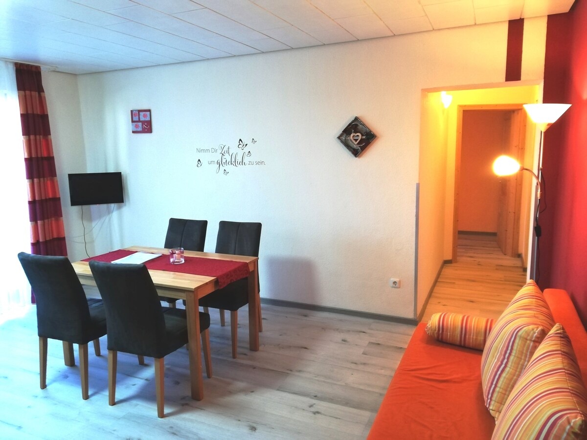 Beautiful, modern and bright apartment in a very quiet location with 3 bedrooms in the attic of an apartment building 1 bedroom with double bed 1 bedroom with bunk bed 1 bedroom with single bed, wardrobe bed and sofa bed Bathroom with shower and toilet Spacious living area Cozy couch area with TV Dining table for 6 people Open, fully equipped kitchen Huge sun terrace with fantastic views Within walking distance: supermarket, several bakers, pharmacy, savings bank and bank, inns, restaurants