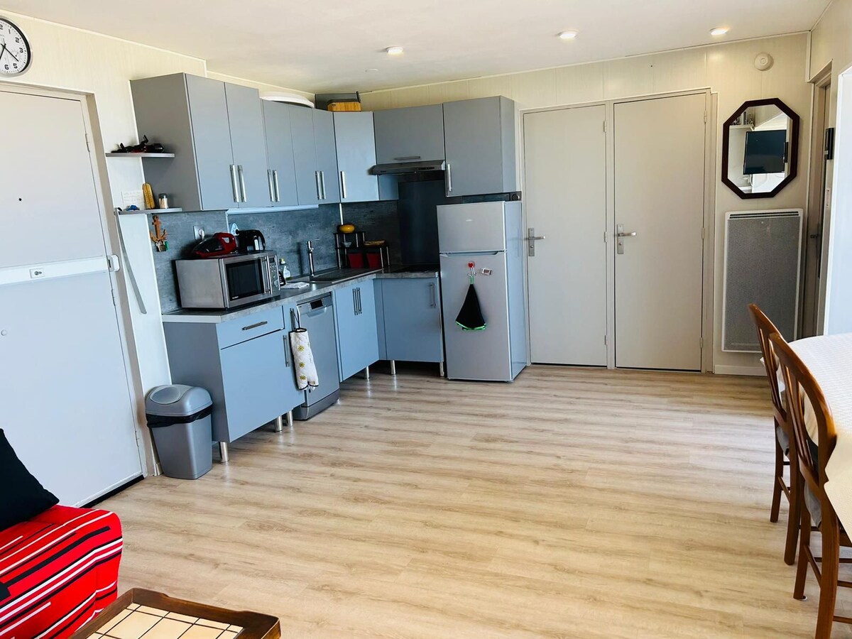 Completely renovated, this magnificent 39 m2 F2 apartment is located on the 4th and top floor of the Le Soleil Levant 2 (La Grande Plage) building on the seafront with direct access to the beach, secure private parking, 2 elevators, Wi-Fi and a superb view of the sea and the Allée des Arts