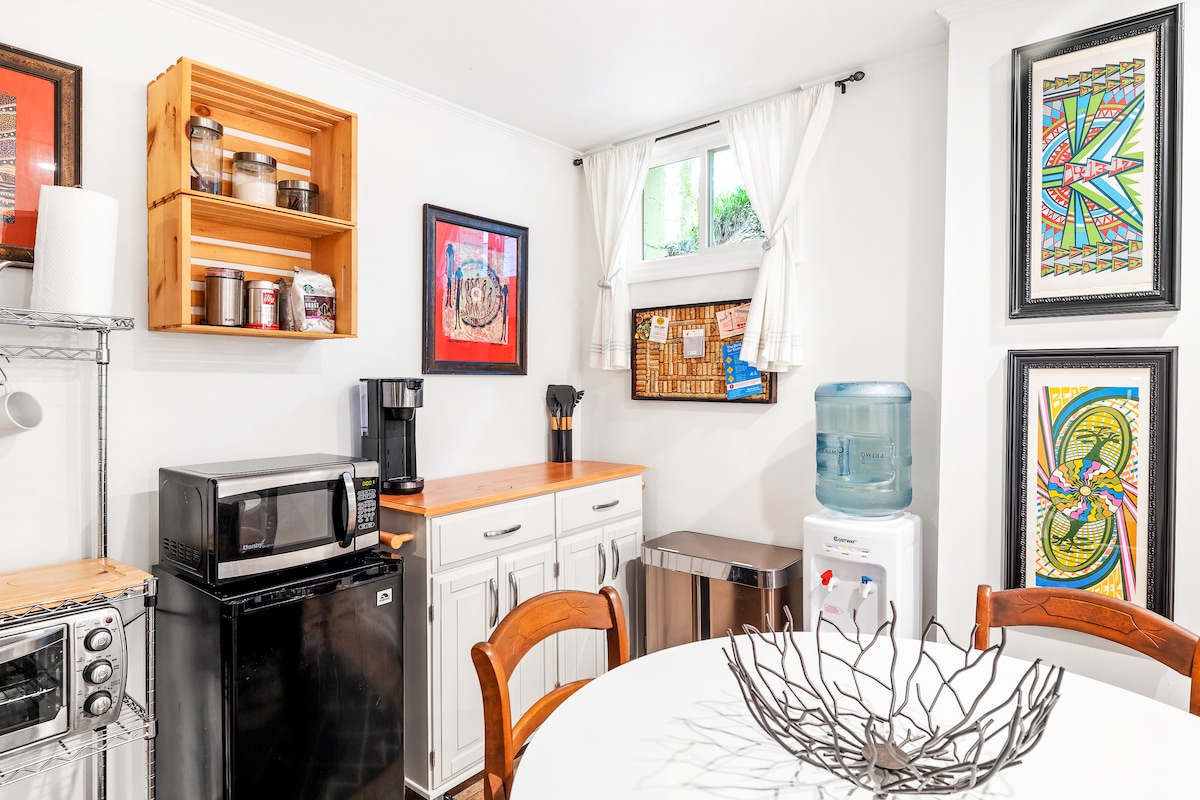 Modern recently remodeled carriage house in Atlanta, GA with quick access to the BeltLine. This open space studio features a comfy queen bed, free high speed wifi and a smart TV. There is a dual purpose table/desk with an ergonomic task chair. The kitchen is fully equipped with all the amenities to prepare your culinary feasts. Enjoy sunsets on the outdoor deck + a gas BBQ grill. With lots of light and a private setting this carriage house offers privacy with the feel of being in a tree house