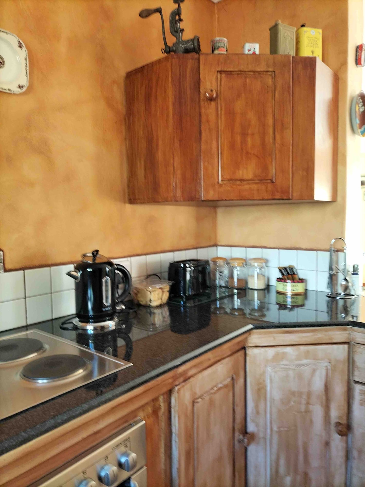 Solar-powered, your suite is 1 of 3, side-by-side, in a garden courtyard behind our 1917 Cape Dutch heritage home. Expect safe gated parking, an en-suite with shower, Netflix, free WiFi, own patio and kitchenette with a small fridge, microwave, and kettle, and a shared barbeque area. You can add breakfast, pre-arrange dinner, or enjoy a drink in our Victorian Boho home and small pub (when open). You are free to enjoy the garden and outside areas, which include a barbeque courtyard.