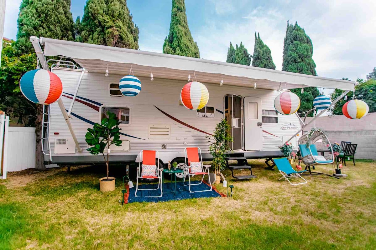 🍭Enjoy the “Glamping” experience with this cute trailer ( RV) 29ft full set up 🛌 Queen bed for 2 adults + bunk bed for 2 kids (Everything is mini size) 💖 Best fit for couple or small family 🍭Prvt parking 🍭𝟭𝟱’ 𝘁𝗼 🏖/𝟯𝟬’ 𝘁𝗼 🎡. 🍭𝗪𝗮𝗹𝗸𝗶𝗻𝗴 𝗱𝗶𝘀𝘁𝗮𝗻𝗰𝗲 𝘁𝗼 🍔🍜🍛& 🏪🛒, 🏞 & 🏥 ✅Location is not fixed. It depends on our parking contract, & it maybe next to busy streets with vehicles traveling 24/24, pls be aware. (Earplugs & white noise machine are available) 🚫 🐶😼🦮 (𝗮𝗹𝗹𝗲𝗿𝗴𝗶𝗰 𝗿𝗲𝗮𝗰𝘁𝗶𝗼𝗻𝘀) 🚫420, drugs