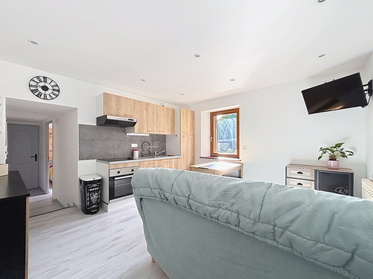 Renovated apartment located in a small family residence in the heart of the old village of Taninges. It includes a living room with sofa bed and equipped kitchen, a bedroom, a bathroom and separate toilet. You will enjoy a magnificent view of the Foron, the castle park and the Marcelly peak. Shops and services nearby. Ideal for a comfortable stay between nature and heritage.