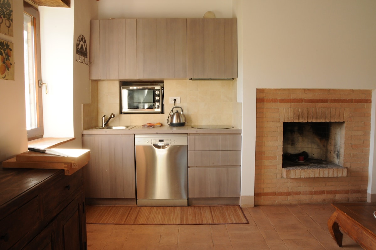 Amazing country house immersed in the vineyard of Cantina Lapone, viewing Orvieto. Recently restored, over 100 sm, organised on two floors. Ground floor is a single space with a big living room (with fireplace) and a spacious open kitchen. First floor with two bedrooms and two bathrooms: the main bedroom (looking at Orvieto) with a double bed and internal bathroom and a second one with a double bed and a bed sofa. Private garden and parking. Private pool (shared with another 4 guests house).
