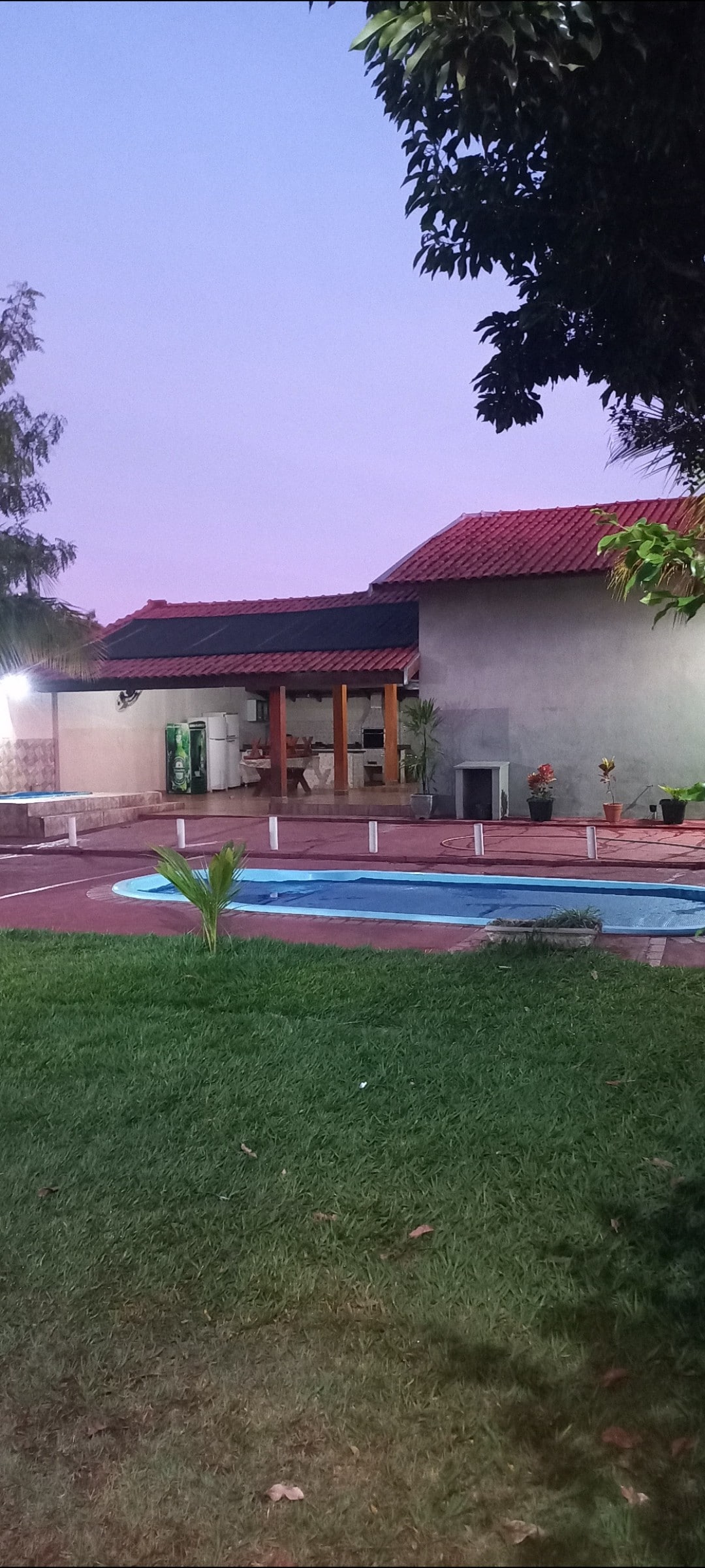 Ranch 8 km from the city, with a collective ramp for boats in the condominium. 3 suites with ceiling fans that accommodate 20 people: 13 in beds (5 double beds, 1 bunk bed, 1 single bed and 1 portable crib) and 7 on extra mattresses (3 double and 5 single); Living room with sofas, armchairs, wall mirror, 32” smart TV. Kitchen equipped with appliances, pots, dishes and utensils. Large balcony with wall fans, laundry room, bathroom and barbecue area.
