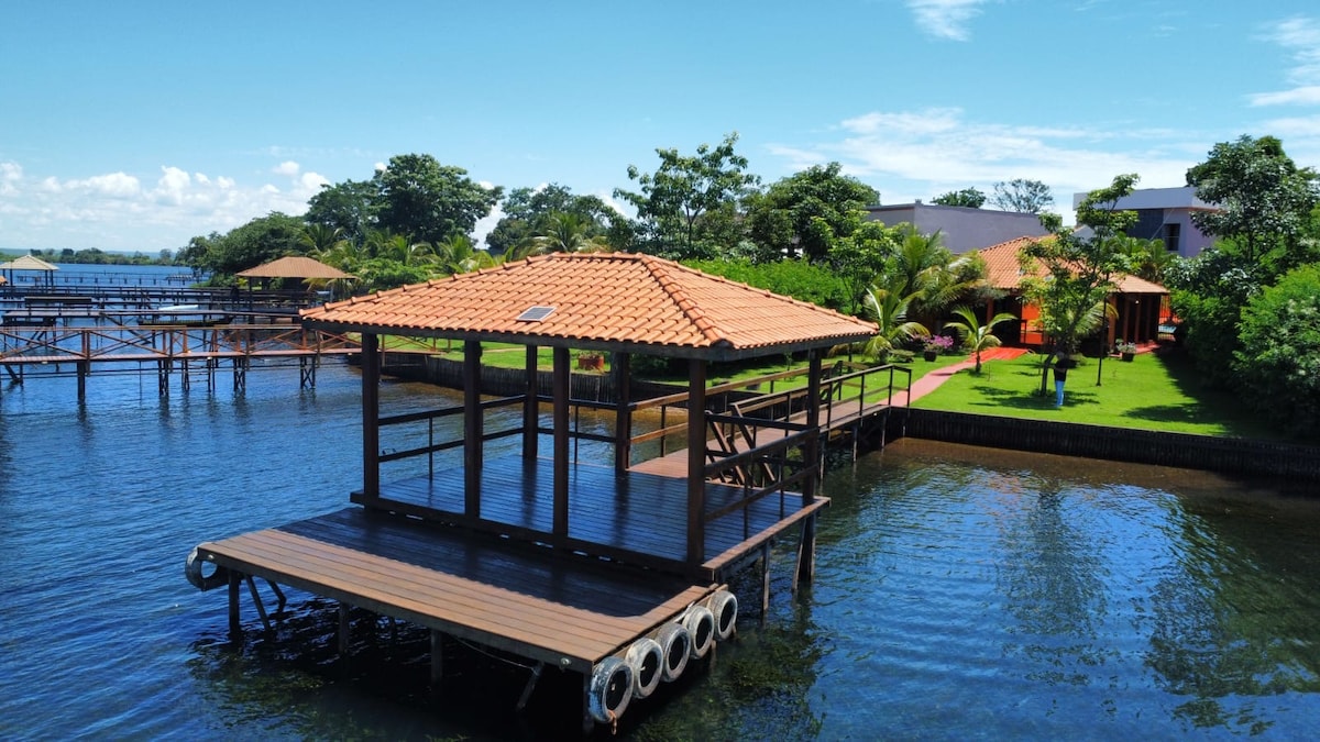 Ranch 8 km from the city, with a collective ramp for boats in the condominium. 3 en-suites with ceiling fans that accommodate 20 people: 13 in beds (5 double beds, 1 bunk bed, 1 single bed and 1 portable crib) and 7 on extra mattresses (3 double and 5 single); Living room with sofas, armchairs, wall mirror, 32" smart TV. Kitchen equipped with appliances, pots, dishes and utensils. Large balcony with wall fans, laundry, bathroom and barbecue area.