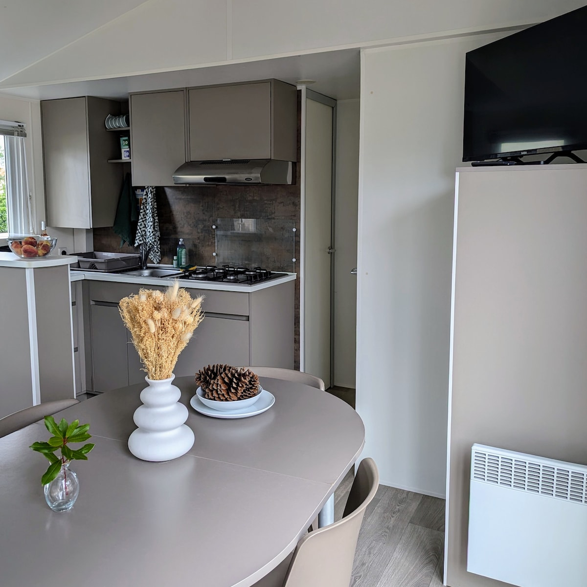 This beautiful 2023 mobile home, ideally located on the La Plage Siblu 4* campsite, near the pine forest and a few minutes' walk from the ocean as well as the town center of the seaside resort will become your favorite vacation home. The advantages: An ideal location with little overlooking. Close to campsite amenities (swimming pool, gym, grocery store) games and books available On request: loan of a baby cot, a child booster seat and a toilet seat reducer