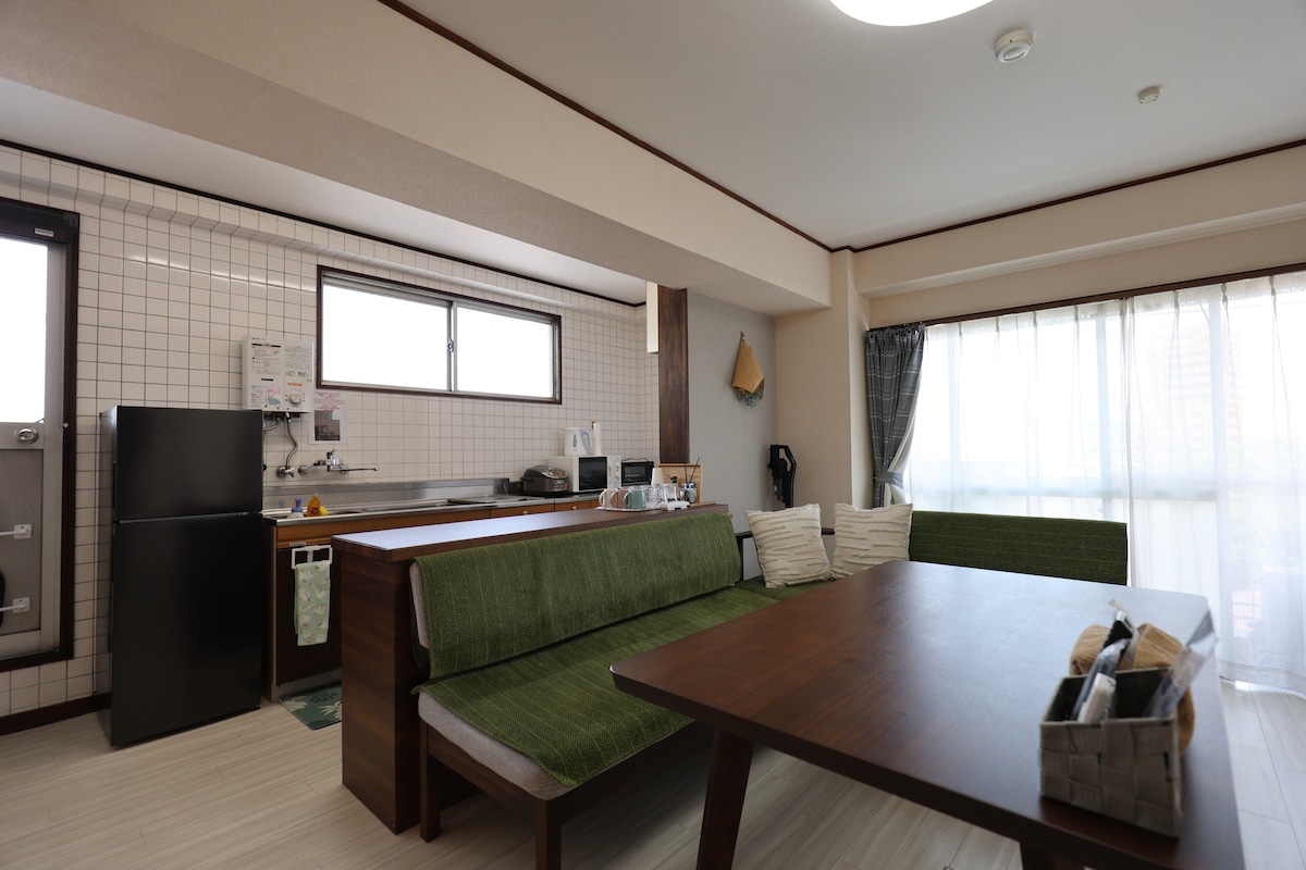Family-friendly apartment on the top 10th floor, built in 2019. A drum-type washer-dryer allows washing and drying in one machine. Toys for children are provided. Matsubara Park is a 1-minute walk away. Two bicycles with child seats (ages 2–6) are available. Restaurants are nearby. 10 minutes to Osu Kannon Station, 11 minutes to Osu Shopping Street. Two double beds are placed side by side for safety.