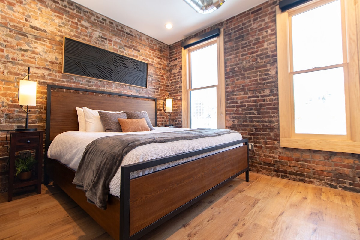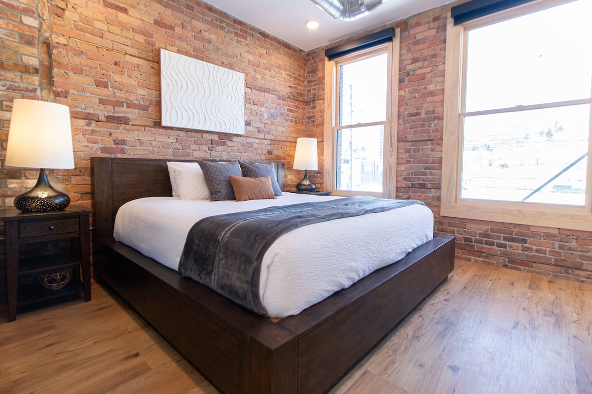 Enger Lofts Hotel is your adventure-town getaway in the heart of the Craft District of Duluth, Minnesota. Remodeled in 2020, this 1800s era warehouse features a modern kitchen, soaring ceilings, & large windows inside an airy, cozy studio.