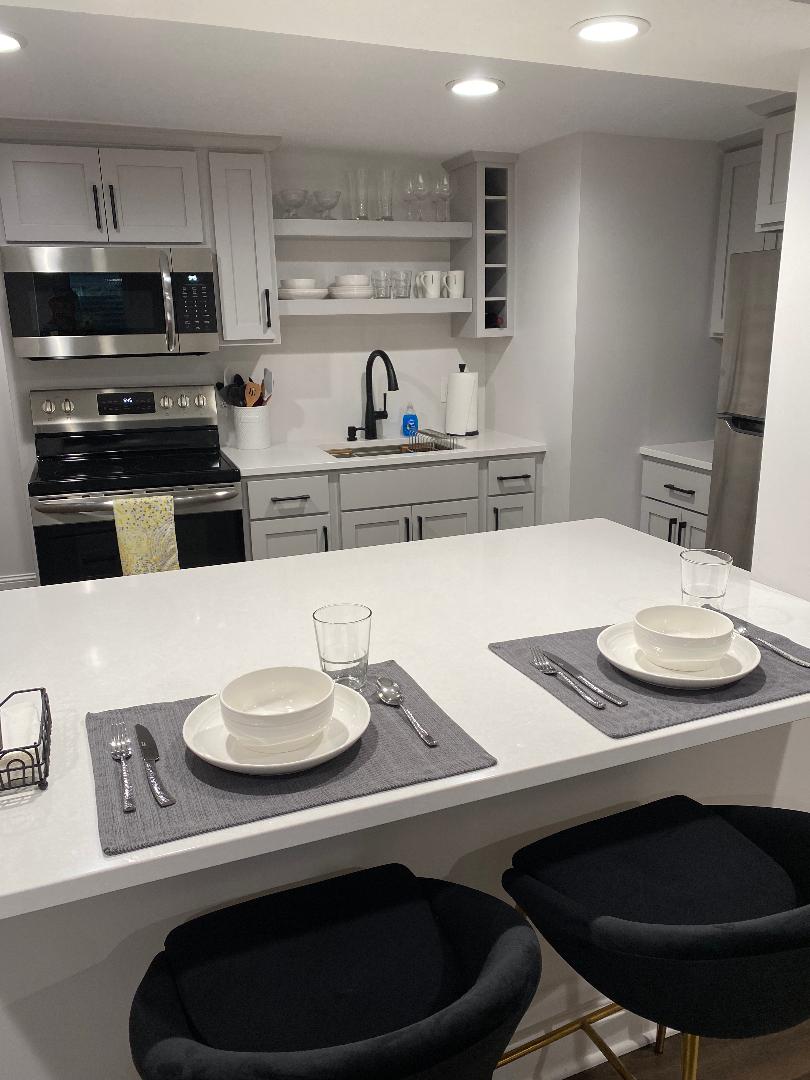 Enter through a private entrance to this basement studio apartment. Newly constructed in 2018, the space is well lit, insulated, and in a quiet neighborhood. Enjoy a full bathroom with laundry, and a kitchenette: 4.5 cu.ft. refrigerator, microwave, extra large toaster oven, hot plate, crock pot, pots, pans, dishes, keurig coffee machine, and full kitchen sink. 1 queen bed accommodates up to two guests. Guests must have at least 3 positive stay reviews to book our space.